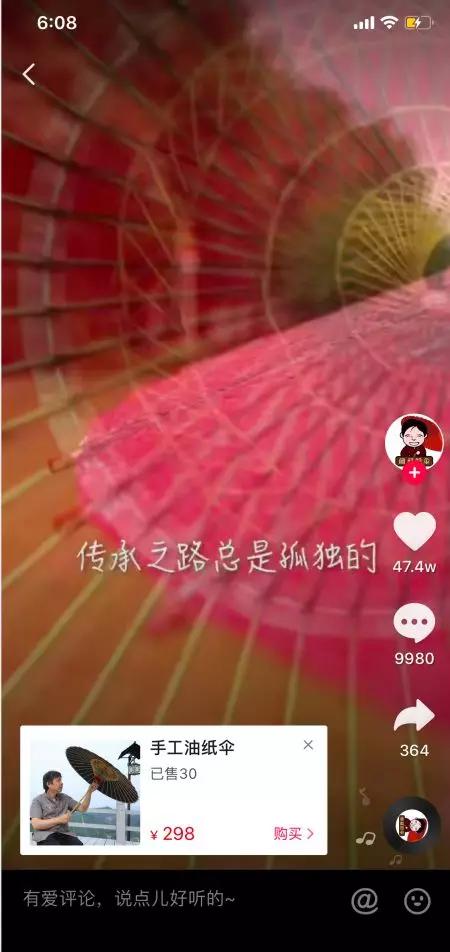 @闻叔的伞 账号主页及橱窗商品 “闻叔的伞”首条视频即收到了将近3500条评论,大多表达了对传统制伞工艺的支持与关注。而闻士善的抖音账号也迅速吸引了接近69.2万多关注者,获得了713万个赞。网友们纷纷在闻叔的视频下表达他们对传统油纸伞的喜爱,惊奇于流传至今的、传统技艺。 亿邦动力了解到,闻士善的手工油纸伞出厂价在几百元到数千元一把不等。在接入抖音的第一个月,寻古就帮帮闻士善转化了10万元的销售额,其中单条视频的最高转化在6万元左右。
