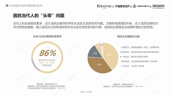 新品头皮「小绿瓶」 再创头皮护理新时代 据第一财经商业数据中心(CBNData)联合巴黎卡诗、天猫美妆洗护、天猫新品创新中心(TMIC)发布的《2021国民头皮护理消费白皮书》显示,近九成民众都同时存在头皮及头发的相关问题。随着洗护发产品功能升级(如护发效果更好以及覆盖头皮、发根到发尾)和相对小众形式的产品使用率的进一步扩大,预计将不断推动市场增长。