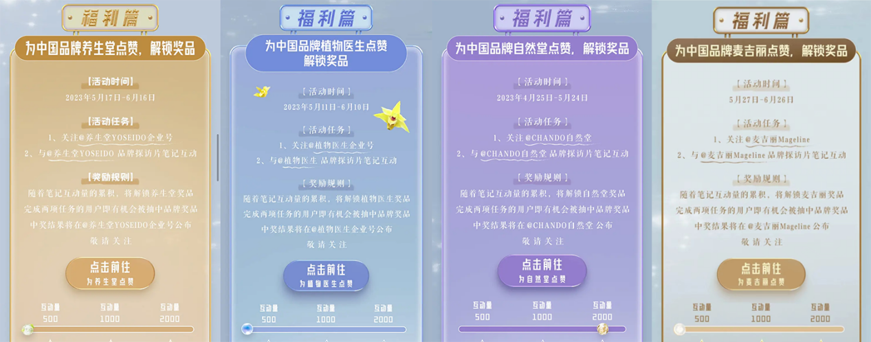 层层递进的活动内容结合站内用户的分享笔记,在活动过程中沉淀为品牌的无形资产,是这场联合媒体、品牌、博主及平台接力进行的破圈声量中有力的一环种草力。这意味着,随着「宝藏成分在中国」活动的传播扩散,小红书同步拓展了消费者对产品及品牌的认知,让「国货不输国际大牌」的定位深入人心。不仅将「产品即内容」落到实处,更展现出「品牌文化」的深层意涵,为品牌打开更多种草场域,也为消费者提供了深入科普传统文化的多种途径,掀起破圈效应。 截止 5月29日为止,活动传播期间收获超 10.4亿的曝光量,话题浏览量超 1.2亿、吸引了1103万余人参与互动,辐射全域年轻人,真正实现了破十亿级别的品牌营销出圈。 以中国宝藏成分 放大国货成分新感知 本次活动于4 月 24 日上线,由小红书官方账号@国货情报官 以#宝藏成分在中国 话题发起号召,借势官宣视频热点,背靠站内成熟互动机制,成功抢占话题热度。 小红薯们可以在#宝藏成分在中国 的话题H5页面和各个品牌活动页浏览活动内容,每个品牌都为小红薯们打造了趣味积分任务场景,建立起互动感十足的种草区域,双活动页互相导流,联动效果升级,达到品牌高效种草,助力宝藏国货精准触达目标人群,从而完成全面提高品类搜索,抢占用户消费心智的营销目的。