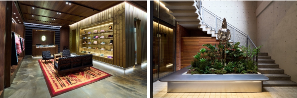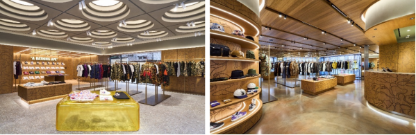 一层地面铺设CEPPO DI GRÉ高级石材,天然纹理低调而奢华。天花板以极具未来感的混凝土结构打造,与醒目的亮橙色陈列装置和温润橡木饰面形成冷暖对比。二层则以大面积橡木铺陈出舒适自然的日式格调,绚丽的LED迷彩屏幕与棕色皮革压纹迷彩沙发相映成趣。此层汇集BAPE®主线服饰、BAPE STA™球鞋及眼镜配饰,并设有独立收银区域,为顾客提供完整而尊贵的购物体验。