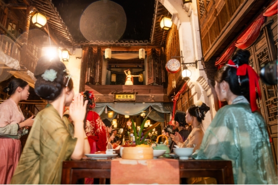 古镇体验更以“动静结合”为特色,营造出张弛有度的度假节奏。“濮院织秋”主题活动通过“遇见宋潮、秋日收藏、织造艺术、疗愈生活”四大单元,打造出丰富立体的体验矩阵:日间可漫步古镇街巷,在颂钵音疗、宋式点茶中静心养性;夜晚则融入“濮院梦华录”超长夜秀,在数十场不间断演绎与近百名NPC构筑的宋韵场景中,体验“我在宋朝躺赢的一天”。这种从静谧疗愈到沉浸互动的自如切换,让游客在动静平衡中真正深入古镇肌理,感受跨越古今的时尚生活方式。