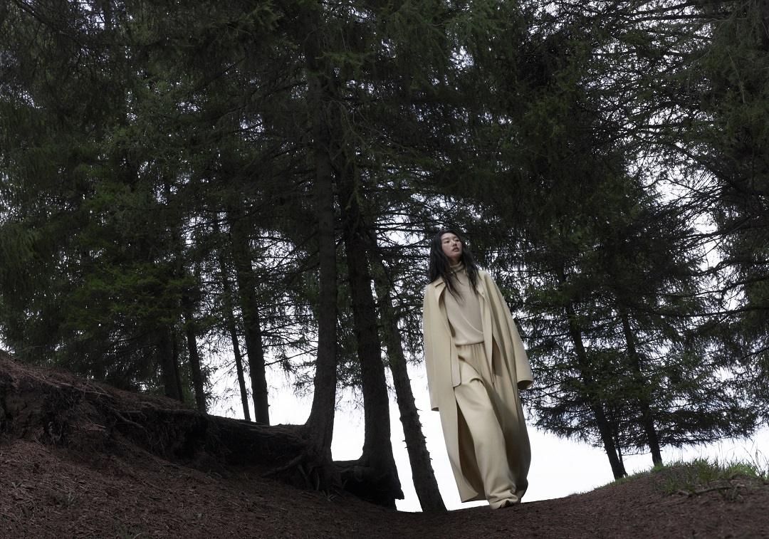 模特走秀图 在材质上,本季产品注重使用高级材质,包括真丝、羊绒、匈牙利鹅绒和环保材料等,将不同材质的巧妙搭配使服饰更具层次感和趣味性。 而在廓形设计上,本季产品更注重廓形比例的平衡,进行了风衣的改良、直线加长和截断等处理,在简洁的平面上展现了更多变化的设计元素。 在配色上,更注重颜色的质感,以灰色为基底,加入灰蓝、灰绿和米黄等柔和的色彩,在轻松的氛围中融入些许模糊的神秘感。丰富的色彩应用于不同的材质上,使得穿着者能够轻松演绎当下的“片刻”。同时,还增加了秋冬黑色组合的趣味性,使整个系列更加丰富多样。