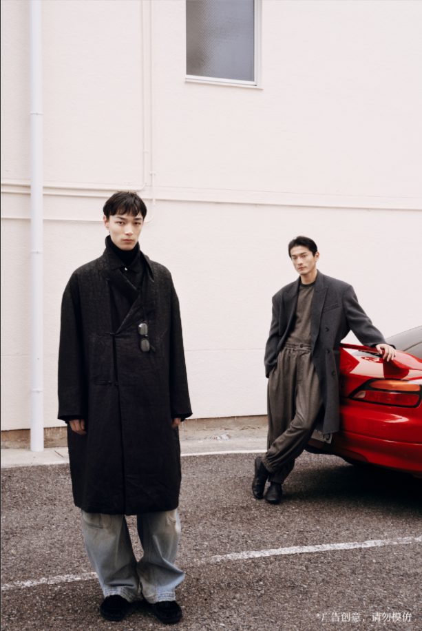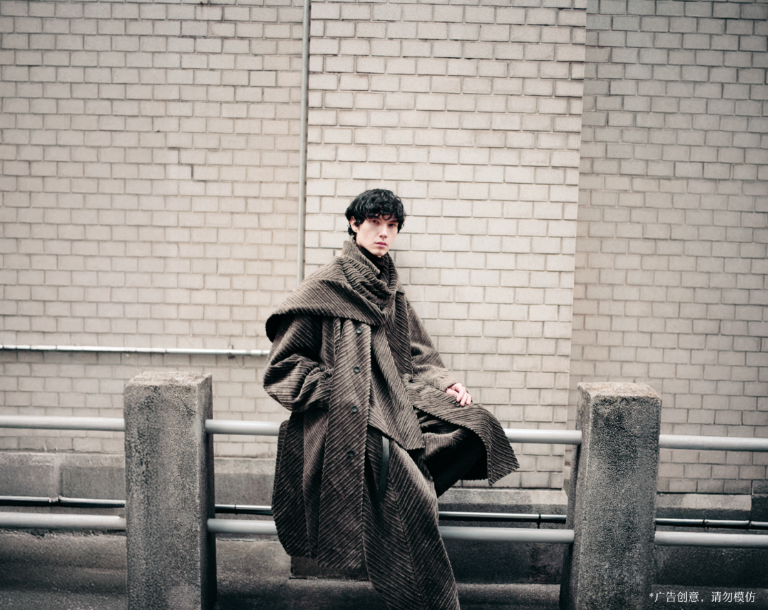 本季延续对新浪潮背景下镜头对人与空间“真实”的表达,在工艺、版型以及面料上精雕细琢,构筑出兼具艺术玩味与经典优雅的冬季衣橱。融合中式平面剪裁与西方立体结构,香云纱面料、针刺工艺等传统设计语言被重新演绎,形成独具东方气质的现代表达,诠释出一种当代的、摩登的、忠于长期主义的玩味姿态。