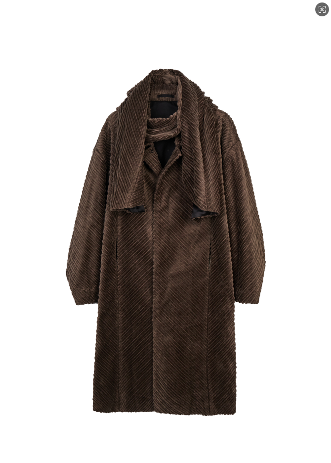 子母条灯芯绒廓形大衣延续经典巴尔玛肯廓形,子母条灯芯绒面料塑造出极强的肌理层次,复古而时髦。点睛之笔的配套围巾设计可自由调节造型,也可系于腰间,赋予速写客充分的造型自由。搭配同面料裤装,可形成极具视觉统一感的套系穿搭,是冬季速写客演绎复古风格的绝佳选择。