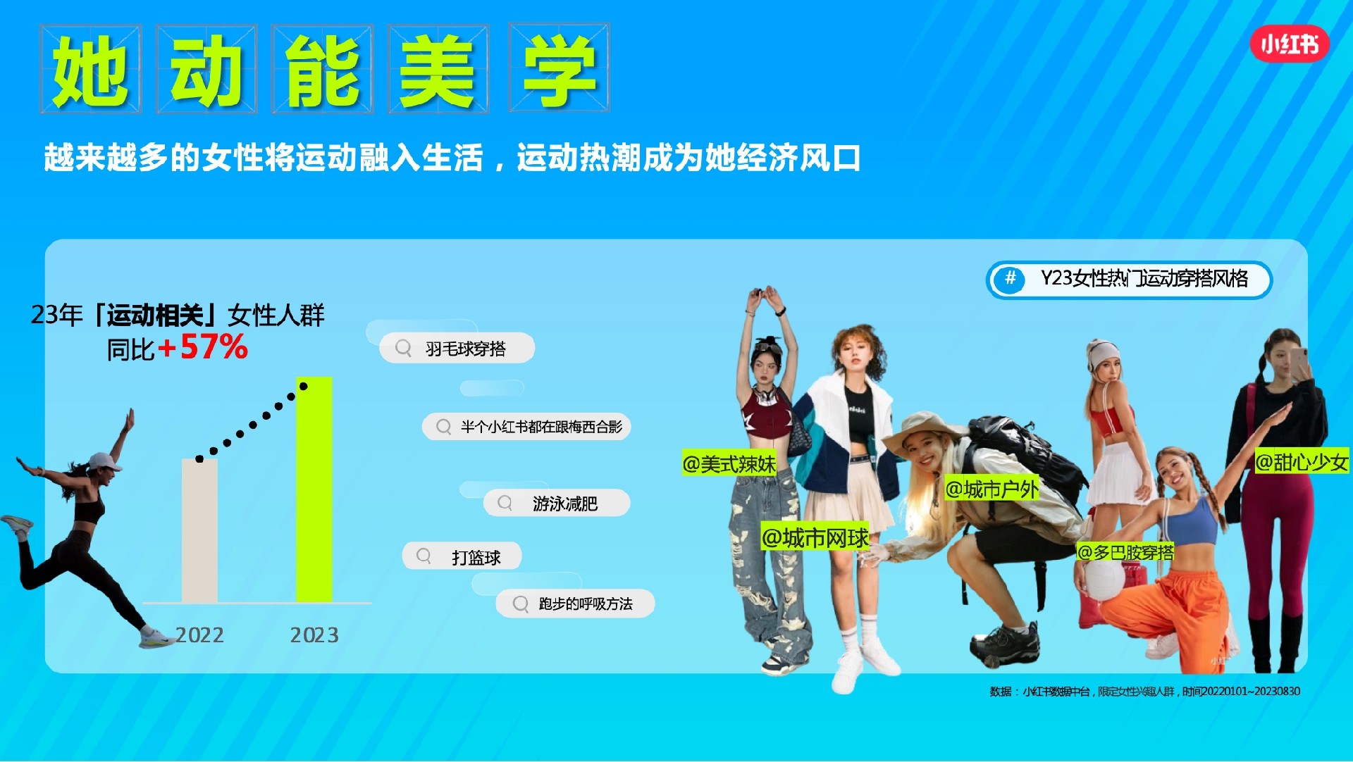 【她动能美学】越来越多的女性将运动融入生活,运动热潮成为“她经济”风口,携手千万个「她」们共同探寻健康生活的正确打开方式。2023年,「运动相关」女性人群同比增长57%,“羽毛球穿搭”“跑步的呼吸方法”“半个小红书都在跟梅西合影”等热搜词留下她们搜索的身影。美式辣妹、多巴胺穿搭、甜心少女、城市户外等多种女性热门运动穿搭风格随之涌现。