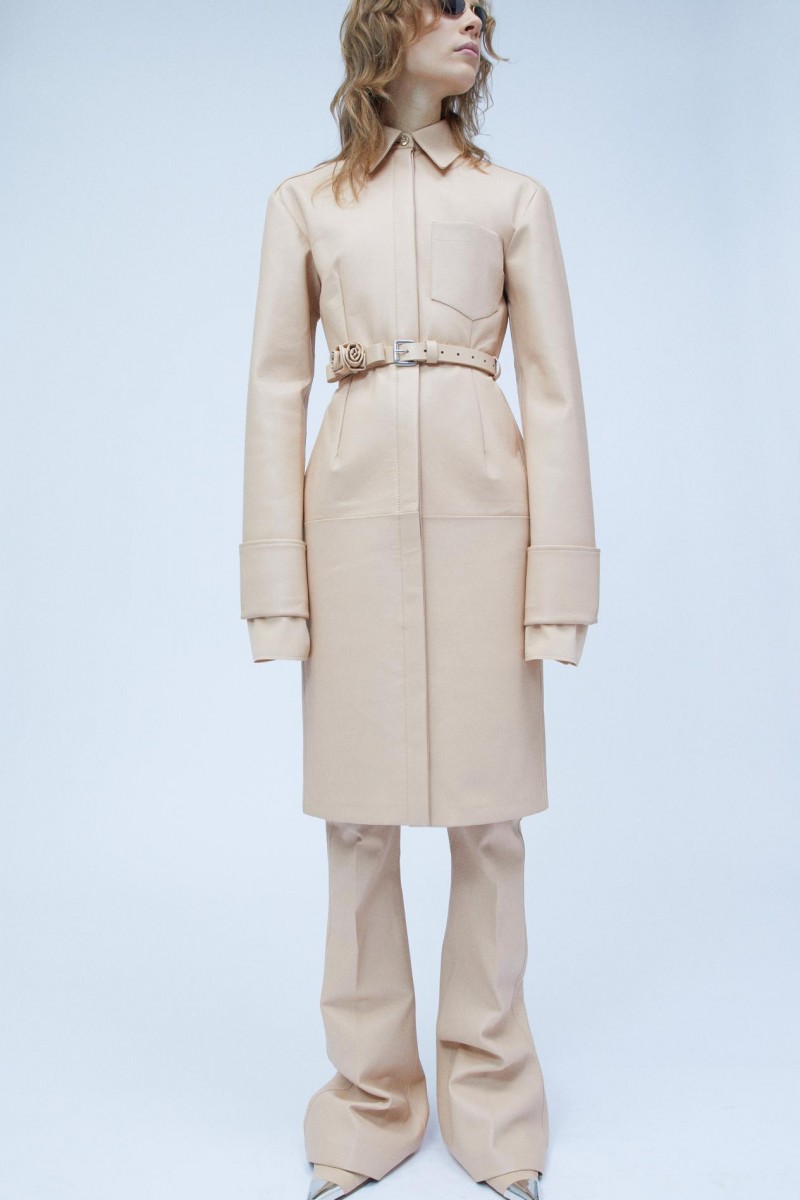 从短款西服上装和女式两件套羊毛衫,到紧身铅笔裙和迷你裙,轻快活泼的小西装与针织款co-ord两件式套装巧妙演绎前卫时尚与利落剪裁,宣示新现代主义美学回归。黑色或奶油香草色皮革短款风衣、带有错视效果紧身上衣的修身紧身连衣裙,以及淡雅柔和、蓬松柔软的“环保皮草”装饰,无不散发曼妙风情。