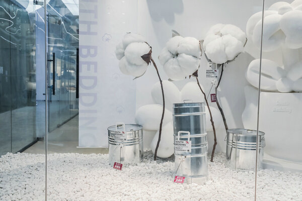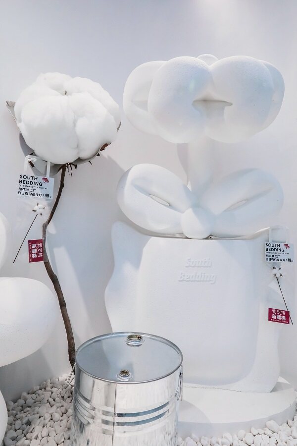 双方都聚焦于让消费者拥有更好的居家生活体验,品牌理念一拍即合,暨共同携手为大众带来一个别样的“理想之家”。对南方寝饰而言,顾家生活是南方寝饰迈出线下概念店第一步的最佳起点。 南方寝饰自2020年开启品牌年轻化转型以来,已获取众多年轻用户的支持,为了进一步增加用户对于产品的信任度,布局线下概念店增加线上产品的深度体验,是南方寝饰战略布局里不可或缺的一步。以此能够搭建用户与品牌更高效、深度互动的新场景,获得更多的有效客户,并挖掘更多的潜在客户。 二、趣味网红打卡,解锁床品消费新体验 概念店内设置创意打卡点,以趣味拍照交互的方式加深年轻消费群体对品牌理念的认知与好感。 「打卡第一站:棉花田里的ta」 橱窗内以纯白色调为主,搭配银色铁艺金属,以10:1模型呈现品牌优选的天然原材“新疆棉花”,等身人高的巨型棉花趣味十足,点燃打卡星人合影分享的热情。