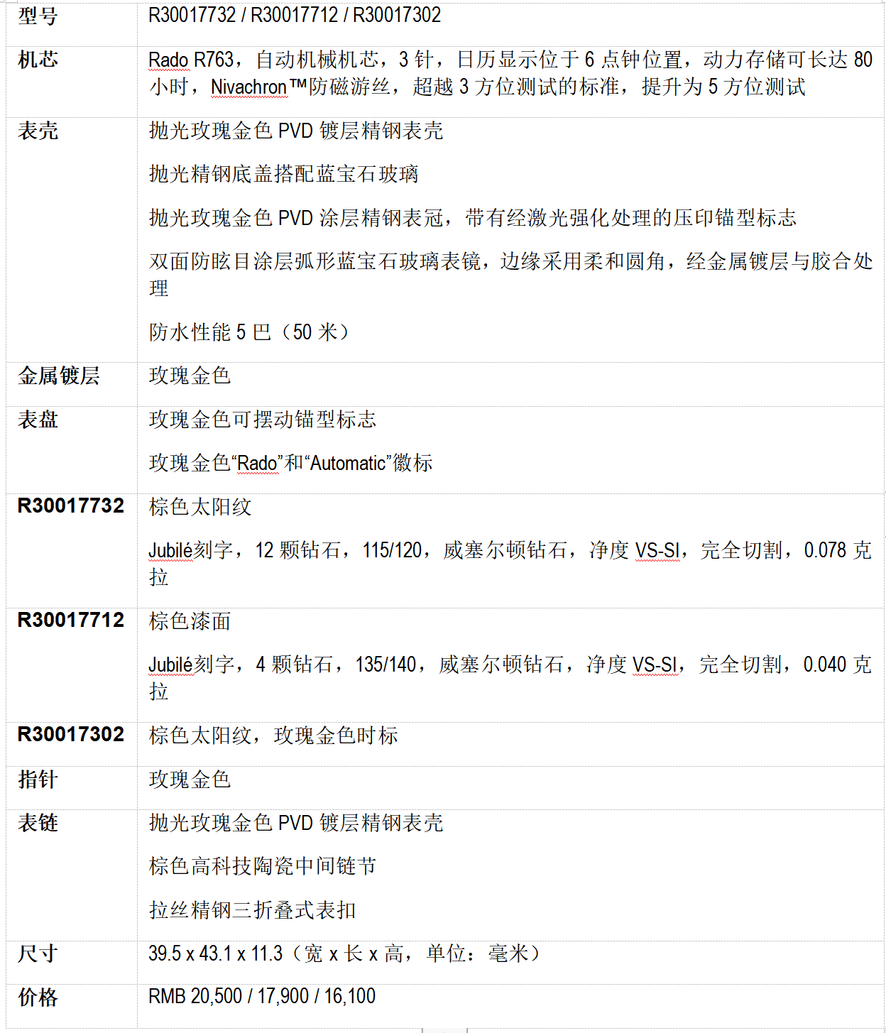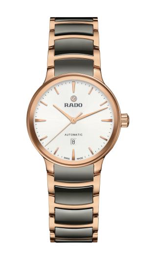 晶萃系列“流金白”镶钻机械腕表 匠心细节 精益求精 以瞩目之姿焕新登场的全新Centrix晶萃系列腕表,拥有相较之前尺寸更大的“Rado”徽标,其中,一部分在时标上镶嵌珍贵宝石的系列新作,更是重新采用了「Jubilé」刻字,彰显奢雅身份。表冠的锚型标志则透过激光细节强化处理,加持其醒目属性,精益求精。从垂直侧面细细观赏,表壳不再是简单的圆柱形,而是呈现精致的圆形,与更加柔和的整体设计相得益彰,顺滑地融合至底盖。全新设计的几何形状底盖,采用更少的标记,并被赋有激光镌刻编号。 所有自动机械腕表款式的底盖都镶嵌蓝宝石玻璃表镜,可以尽情鉴赏内部优质Nivachron™游丝机芯及其自动上链的力量之美。加持佩戴的舒适度与安全度,该系列腕表采用了可靠的三折叠式精钢表扣取代过去的扣合装置,并以采用高科技陶瓷作中间链结,将匠心用意,精致到每一个细节之处。