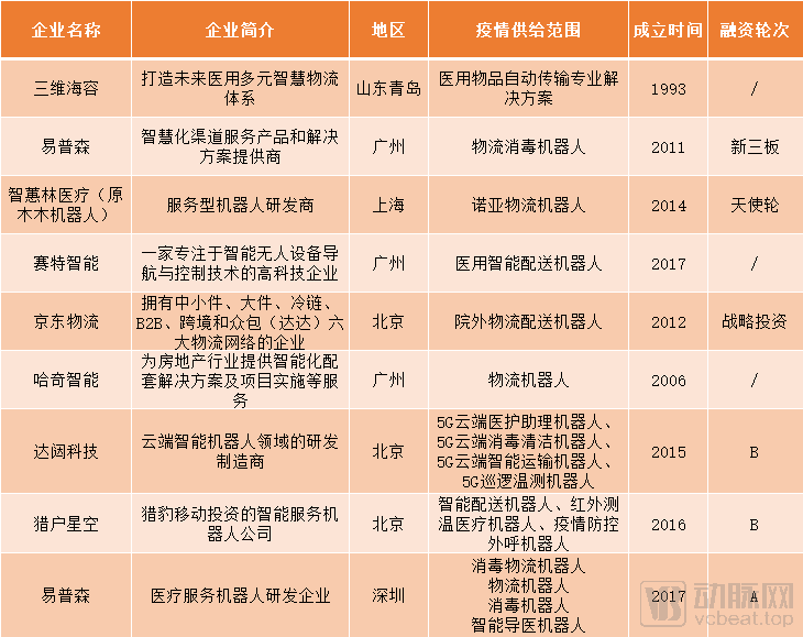 为疫情做贡献的物流机器人企业(资料来源:动脉网根据公开资料整理) “本身我们在武汉的亚心医院、同济医院以及武汉市中心医院就有十几台产品,公司的高层非常重视本次疫情发展,大年初一紧急研究情况,确保在疫区及所有医院的机器人稳定高效工作,同时加快生产。”智蕙林医疗(原名木木机器人)产品副总胡彬告诉记者,“诺亚是医院物流机器人行业唯一自己拥有工厂的品牌,诺亚的工厂和产品均拥有国家的CR认证(中国机器人产品认证)。疫情紧急,工厂当地(江苏如皋)政府特批诺亚机器人工厂复工,我们便开始了轮班无休的生产,产能已经提升至平常的2倍以上。” 早在2017年10月诺亚医院物流机器人就已经进入医院,在此期间不断拓展机器人在医院中的应用场景,从最开始做PIVAS补液配送,到后来逐渐增加到配送口服药、标本、高值耗材、无菌包、污洗器械回收等多个场景,目前已实现医院全场景智能配送。值得一提的是,2019年4月初,诺亚已将5G技术应用到其医院物流机器人中,在4G或5G的医院均可以使用。 针对此次疫情,诺亚快速开发了与之对应的机器人自消毒功能。推出了专业消毒柜式物流机器人,这款新型的物流机器人内部自带消毒模块,能够利用光消毒技术,保证柜内环境清洁的同时,也对放入柜内的物资进行消毒,进一步防止病毒的传播。据了解,目前该产品已基本完成测试,即将上市使用。此外,诺亚目前正在研发机器人外表面的立体自动消毒技术,在洁净等级要求不同(如ICU、感染病房、手术室等)的区域连接处,为机器人配置一个小的物理空间让机器人进行自动消毒,进而满足洁净要求,实现安全配送。 在此次疫情中,诺亚机器人是满负荷运行的。为防止机器人出现故障,诺亚配备了售后服务人员,通过在线状态远程监控,确保运行稳定。截至目前,运行稳定。 物流机器人中,还有一款细分品类——配餐机器人。这类机器人以往的应用场景多为餐厅、宾馆等消费服务类行业。在抗击疫情的过程中, 我们也看到了本与医疗毫不相关的他们的身影。 大年初一的晚上,深圳市普渡科技有限公司的创始人张涛接到了两个电话,分别来自杭州和深圳两个隔离点的。电话中张涛得知给隔离点的送餐、送药成为了困扰。随即张涛联系了其他普渡科技的高管召开了高层会议,决定用机器人驰援疫区。 第二天,普渡科技就安排了工程师奔赴一线,为深圳的一家酒店隔离点送去了 6 台机器人。经过简单的现场调试,很快就在病房里启动了配送任务。 正值春节,物流公司基本停运,多数地区又封城和交通管制,物资和人员都很难调配。张涛告诉动脉网,“人员的流动非常困难。进不来,出不去。需要开各种证明,有的疫区在人员到达之后需要先行隔离14天才能开展工作,在医院或隔离点的机器人部署工作仅需要1到2个小时即可完成,然后转战下一个地点又需要继续隔离14天。” 普渡科技的送餐机器人原只是供给包括海底捞在内的餐厅使用。这次疫情让这家餐饮机器人公司第一次接触医疗场景。据了解,普渡科技成立于2016年,经过了 3 轮融资,公司已经陆续有 5 款送餐机器人产品上市,去年已经实现了盈亏平衡甚至盈利。 张涛表示,普渡的送餐机器人在医院运行得非常顺畅,对他们而言,机器人进入医院是一种技术降维。因为餐厅过道窄、桌椅摆放复杂、不同餐厅布置差异较大、餐厅中走动的人多,所以普渡面向餐厅场景的算法在定位、建图、路径规划、调度、感知、避障等方面都更为复杂。 为进一步适应医院场景,减少感染,普渡对机器人进行了进一步的改进,由之前的点击屏幕操作,更改为通过语音、延时等方法免接触式操作。同时在托盘上放置装食物或药品的置物盒,方便使用者定期更换和消毒。在疫区,普渡机器人的传感器会自动感知环境,自己构建地图场景,自动调节速度,最快速度达1.2m/s。 消毒机器人